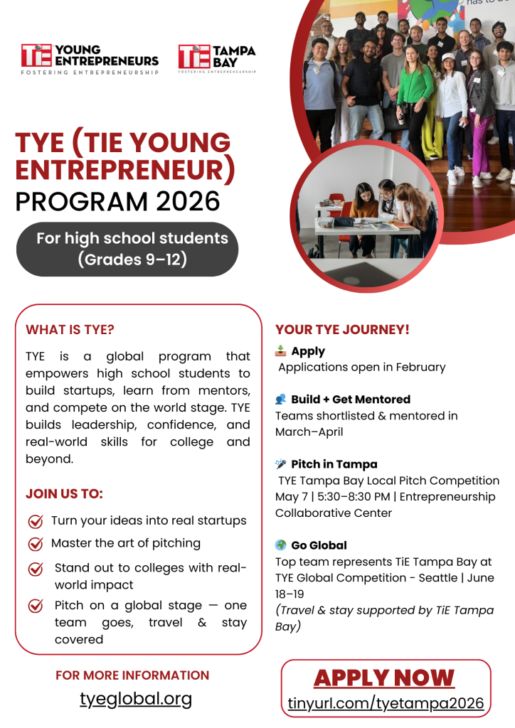 The TYE Global program brings together high school entrepreneurs from TiE chapters worldwide to pitch real ventures, connect with mentors, and gain hands-on experience in innovation and leadership. SlipShield+’s recognition is a proud moment for TiE Tampa Bay and a celebration of the talent, creativity, and drive of the next generation of changemakers.